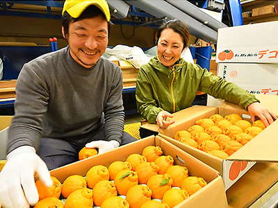 収穫したみかんは、1週間程度予措 (追熟) させてから、ひとつひとつ丁寧に手選別で箱に詰めて出荷しています。